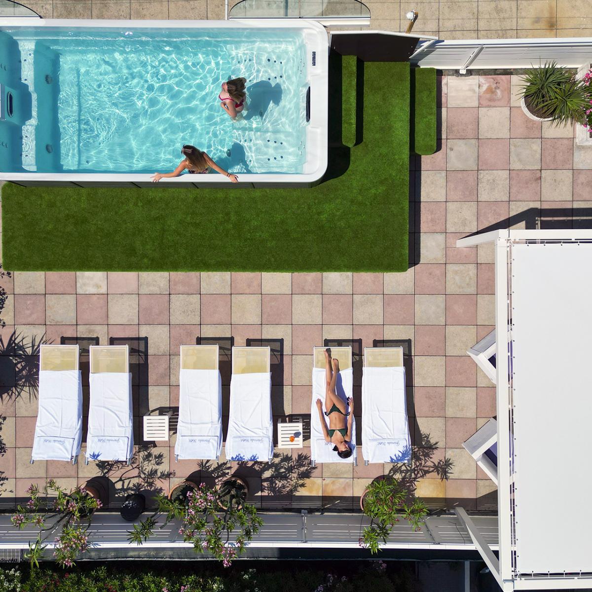 - Una jacuzzi extra-large, profonda 1,20 m, perfetta per distendersi e lasciarsi massaggiare dai potenti getti d’acqua, oppure per provare l’esperienza del nuoto controcorrente.
